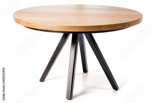A wooden table with black legs and a round top