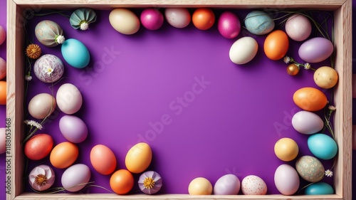 A wooden tray with a vibrant purple background, adorned with colorful Easter eggs arranged in a circular pattern, creating a festive backdrop.