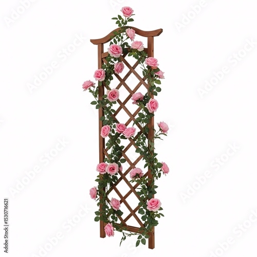 A wooden trellis with pink roses climbing upwards