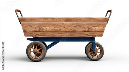 A wooden wheelbarrow with metal handles and wheels, positioned on a white background, showcasing a rustic design.