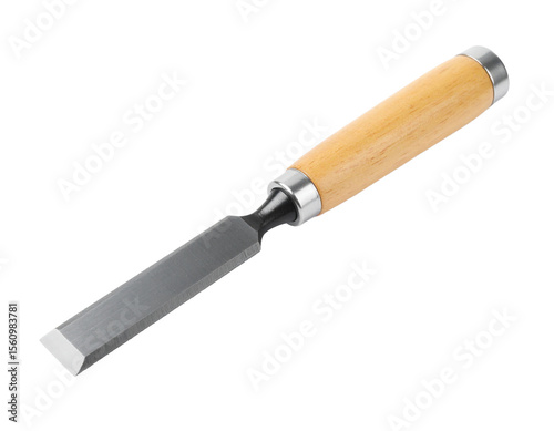 A woodworking chisel with a wooden handle, isolated on a white background, a precise tool for carving and shaping wood.