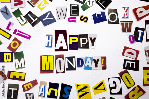 A word writing text showing concept of Happy Monday made of different magazine newspaper letter for Business case on the white background with copy space