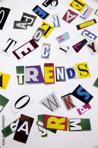 A word writing text showing concept of TRENDS made of different magazine newspaper letter for Business case on the white background with copy space