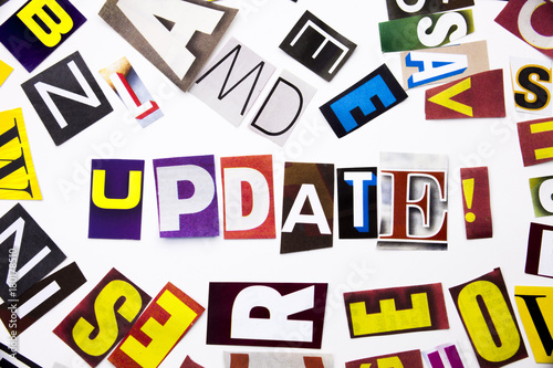 A word writing text showing concept of Update made of different magazine newspaper letter for Business case on the white background with copy space