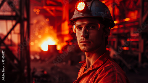 A worker at an industrial plant in a helmet against the background of a burning fire. Steel Plant. Industry concept.
