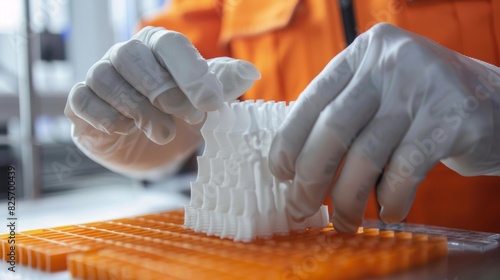 A worker carefully inspecting the 3D printed elements for quality control before they are installed on the construction site.