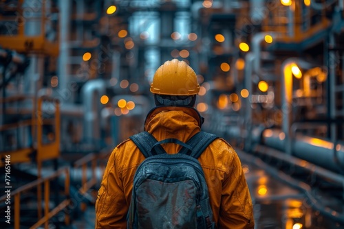 A worker clad in protective workwear stands focused and prepared in an industrial environment, symbolizing human labor and industry