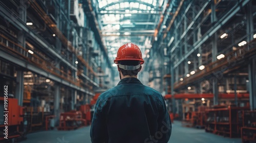 A worker in a hard hat stands in an expansive industrial facility, gazing at the towering shelves and machinery around him.