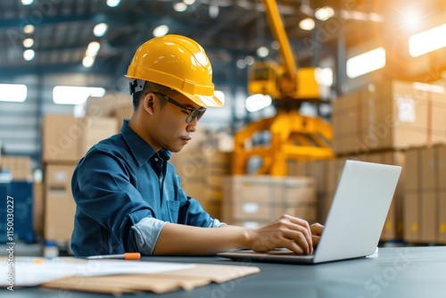 A worker in a hard hat uses a laptop in a warehouse setting, surrounded by boxes and machinery, illustrating modern industrial work.