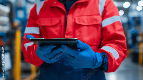 A worker in a vibrant safety jacket and gloves holds a tablet, standing in an industrial environment to illustrate modern technology in the workplace.