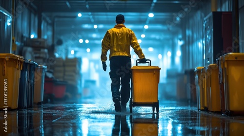 A worker in a yellow raincoat pushes a cart through a wet, dimly lit warehouse filled with bins