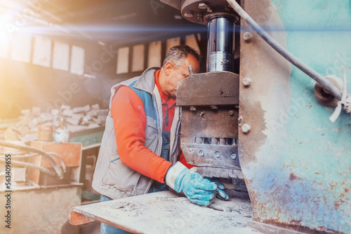 A worker in heavy industry breaks stone blocks using large machines. Granite and stone processing industry.