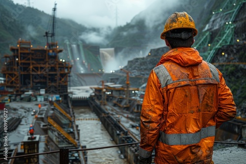 A worker in orange reflective gear stands overlooking a busy industrial construction site amid misty mountains