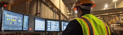 A worker in safety gear operates multiple screens in an industrial setting, showcasing a high-tech environment focused on monitoring and control.