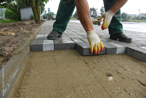 A worker lays paving slabs on the sand, paves a road for pedestrians.