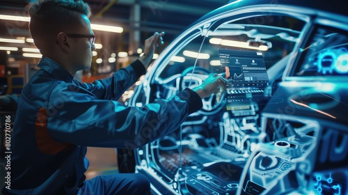 A worker monitoring the production process through a digital interface in a high-tech EV manufacturing facility.
