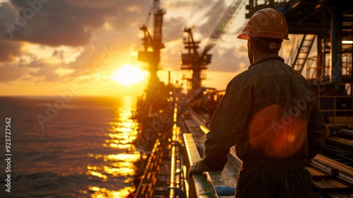 A worker overlooking an oil rig at sunset, symbolizing industry and hard work.