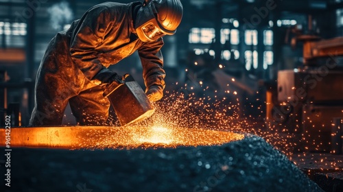 A worker pouring molten metal in a foundry, creating sparks in an industrial setting.