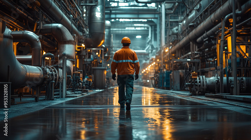 A worker walks through an industrial plant, wearing orange safety and a helmet, surrounded by steel pipes and machinery. The scene is illuminated with soft lighting that casts long