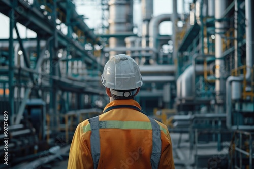 A worker wearing a hard hat stands in a factory setting
