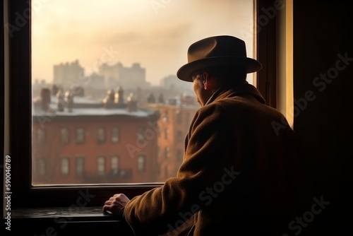 A worker with a hat and jacket at a window with the city seen. Generative AI.