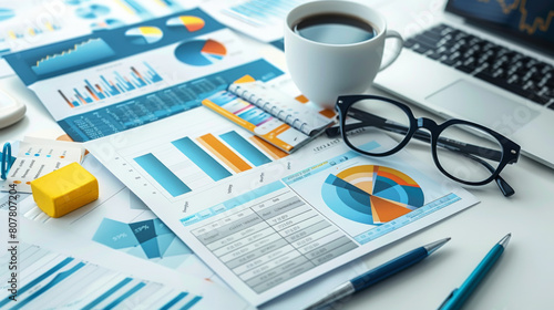 A workspace filled with business charts, graphs, and data analysis papers, highlighting detailed planning and strategy.