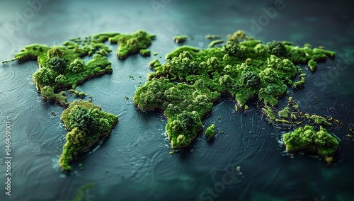 A world map made of green moss, highlighting global environmental areas such as forests and oceans.
