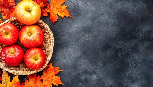A woven basket filled with fresh red apples surrounded by vibrant autumn leaves on a textured dark surface, suitable for fall-themed designs, food-related projects, or seasonal marketing materials,