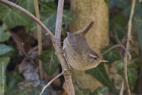 A wren (Troglodytes troglodytes) climbing on a branch, embedded in green foliage, Hesse, Germany