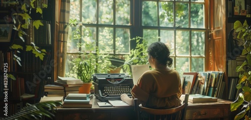 A writer drafting a novel on a vintage typewriter, with a cozy, bookfilled room and a large window offering a view of a serene garden