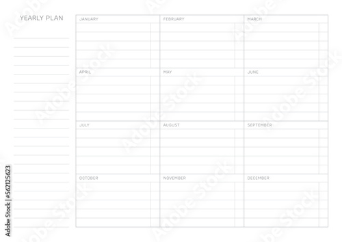 A year goal plan template with a simple and minimal style. Note, scheduler, diary, calendar planner document template illustration.