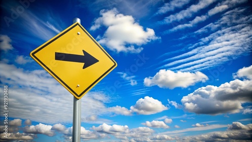 A yellow arrow-shaped street sign with a stylized bold font logo displaying a direction indicator on a cloudy blue sky background.