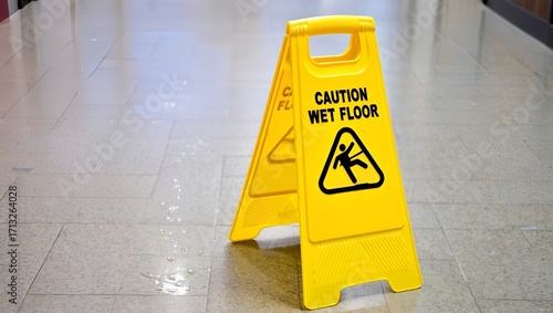 A yellow caution sign alerts pedestrians to the slippery wet floor, a potential hazard.