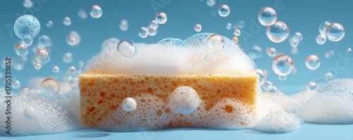 A yellow cleaning sponge submerged in white suds and surrounded by floating bubbles against a light blue background