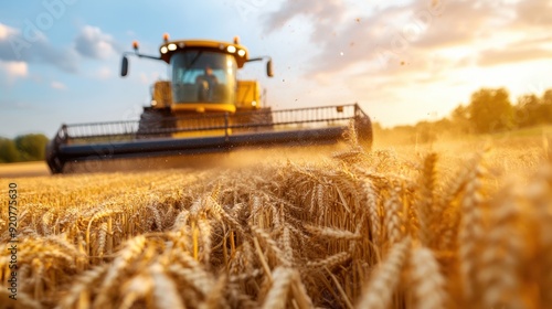 A yellow combine harvester efficiently gathers wheat in a sunlit field, representing the blend of agricultural technology and the timeless practice of farming.