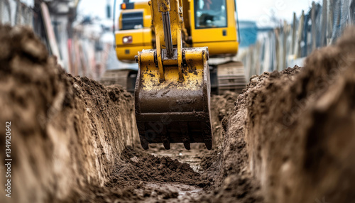 A yellow excavator is actively digging into the dirt at a construction site. The heavy machinery is engaged in earth-moving tasks amidst surrounding infrastructure