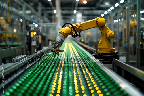 A yellow robotic arm on a factory floor with a conveyor belt with glowing green lights, picking up a small item.