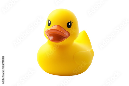 A yellow rubber duck is sitting on a white background