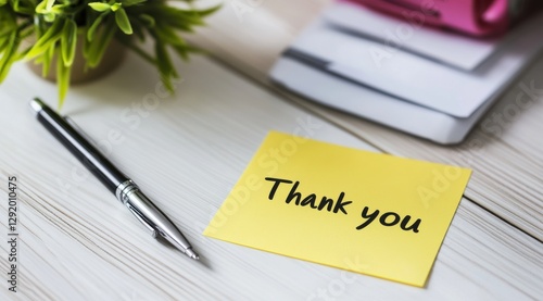 A yellow sticky note with Thank you written in simple handwriting, placed on a wooden desk next to a pen, placed on a desk