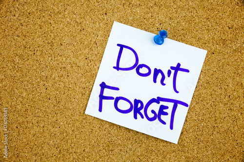 A yellow sticky note writing, caption, inscription don't forget written on color sticker notes over cork board background