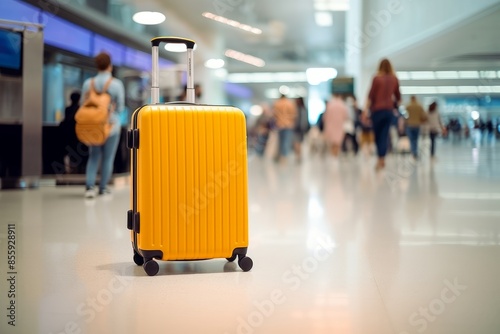 A yellow suitcase in the airport waiting room. The concept of travel, vacation.