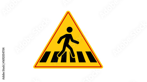 A yellow triangular warning sign for a pedestrian crossing, featuring a walking figure on a zebra crosswalk, isolated on a white background