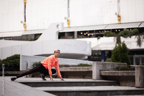 A young adult woman in bright orange sportswear stretches her legs, preparing for a jog in a city environment with modern architectural background.