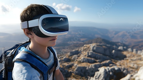 A young adventurer explores virtual reality in the mountains, blending nature with innovative technology for an immersive experience.