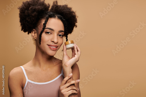A young African American woman with a radiant smile holds a cream jar, showcasing her beauty and confidence.