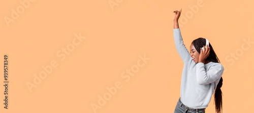 A young African American woman with long hair enjoys her favorite tunes while dancing with enthusiasm. She wears a cozy sweater and headphones, copy space