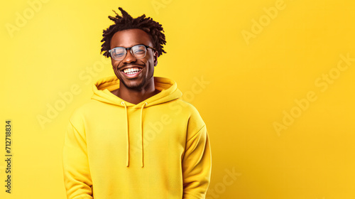 a young African man exudes a radiant smile against a vibrant yellow background.