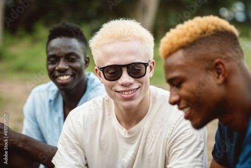 A young albino black man with a group of young people sitting in a row close together, talking or listening attentively.