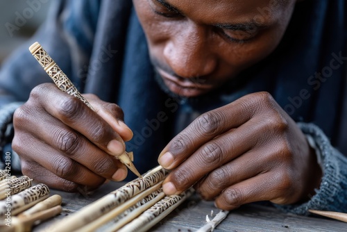 A young artisan is meticulously carving beautifully designed woodwork, illustrating the creative spirit and the exploration of art through hands-on craftsmanship in a serene environment.