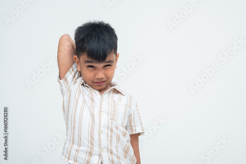 A young Asian boy grimacing as he scratches his back, struggling to reach and appearing uncomfortable and slightly annoyed. Isolated on a white background.